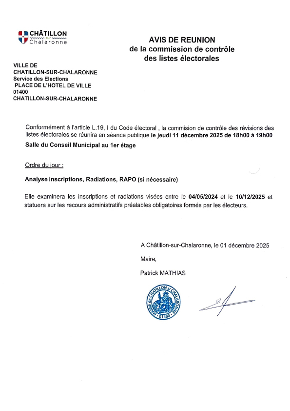 Conformément à l’article L.19, 1 du Code électoral, la commission de contrôle des révisions des listes électorales se réunira en séance publique :