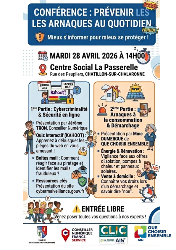 Le CLIC de la Dombes, en partenariat avec Jérôme TRON, Conseiller numérique de la Communauté de communes de la Dombes, et QUE CHOISIR ENSEMBLE de l’Ain, organise une conférence dédiée à la prévention des arnaques du quotidien. Cette rencontre se tiendra le mardi 28 avril 2026 à 14h, au Centre social La Passerelle.